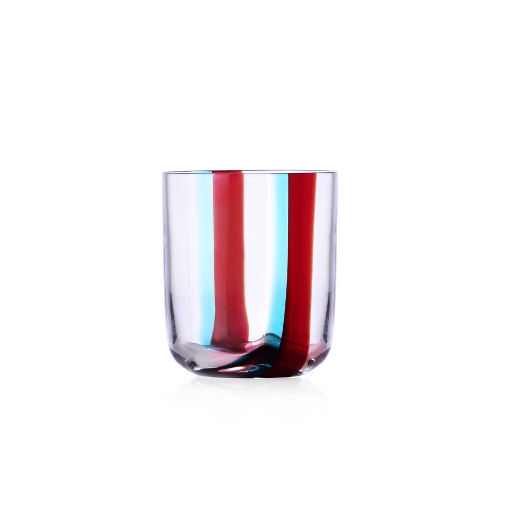 Bicchiere in vetro colorato in pasta, soffiato a bocca in stampo fisso e rifinito a mano.