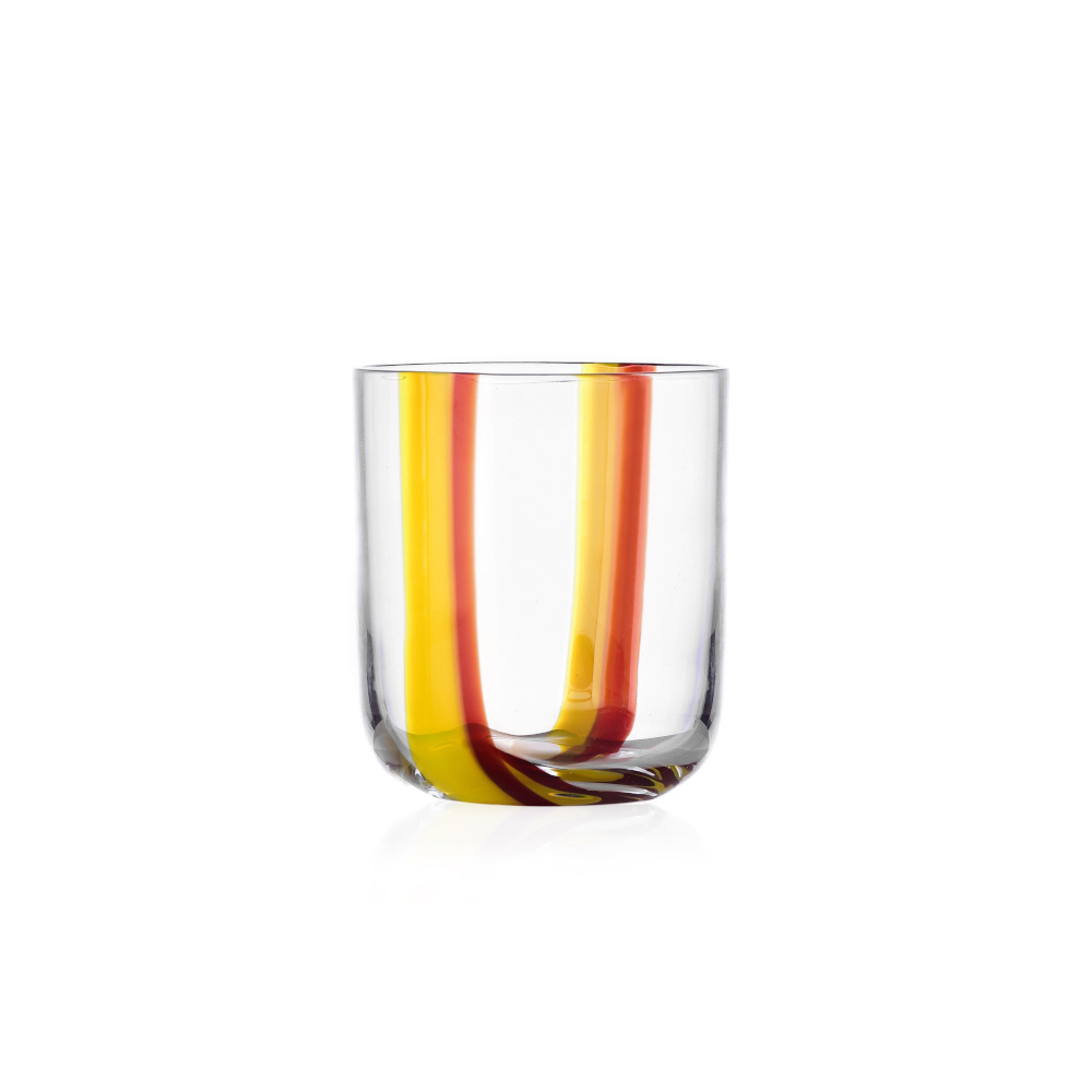 Bicchiere in vetro colorato in pasta, soffiato a bocca in stampo fisso e rifinito a mano.