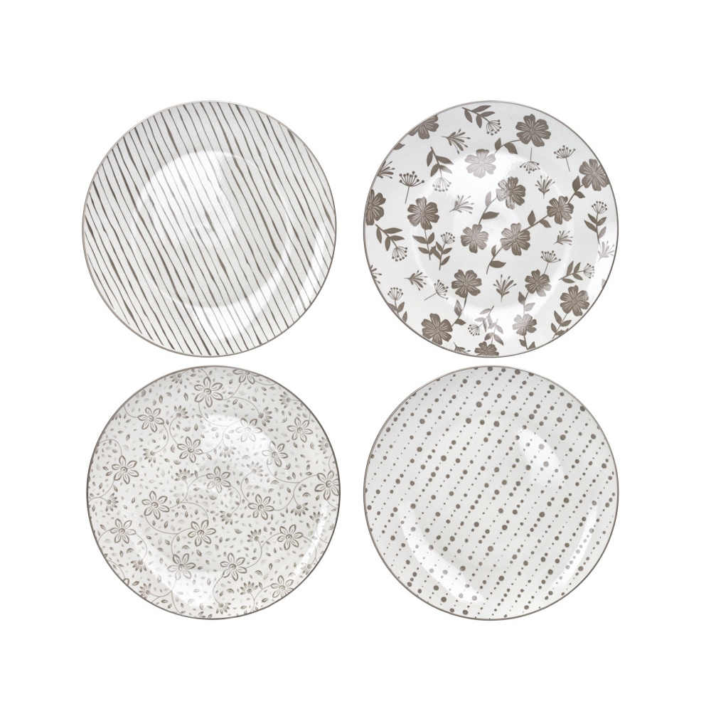 Un set di 4 piatti piani con decoro floreale e geometrico uniti da un tenue ed elegante color tortora.